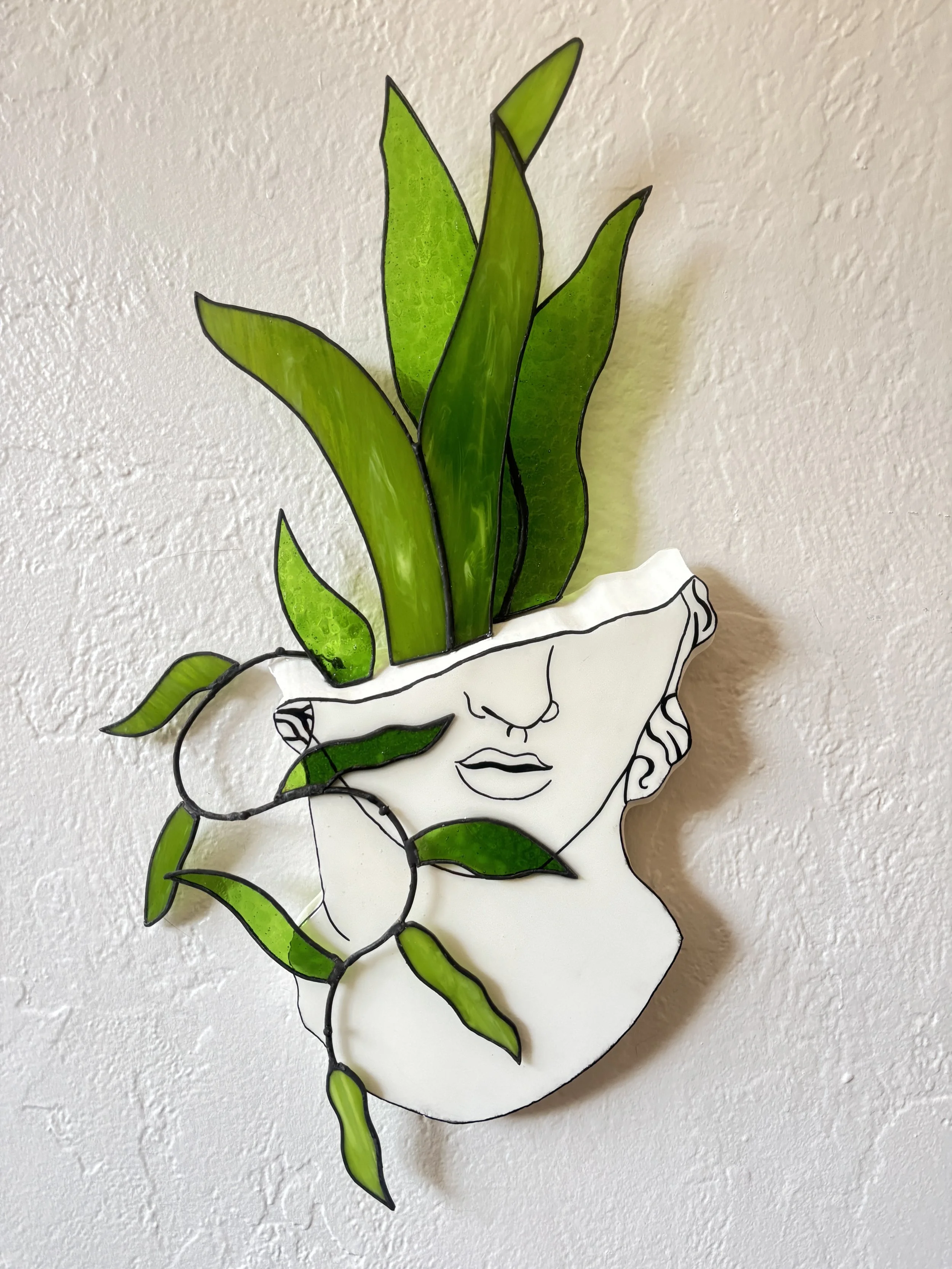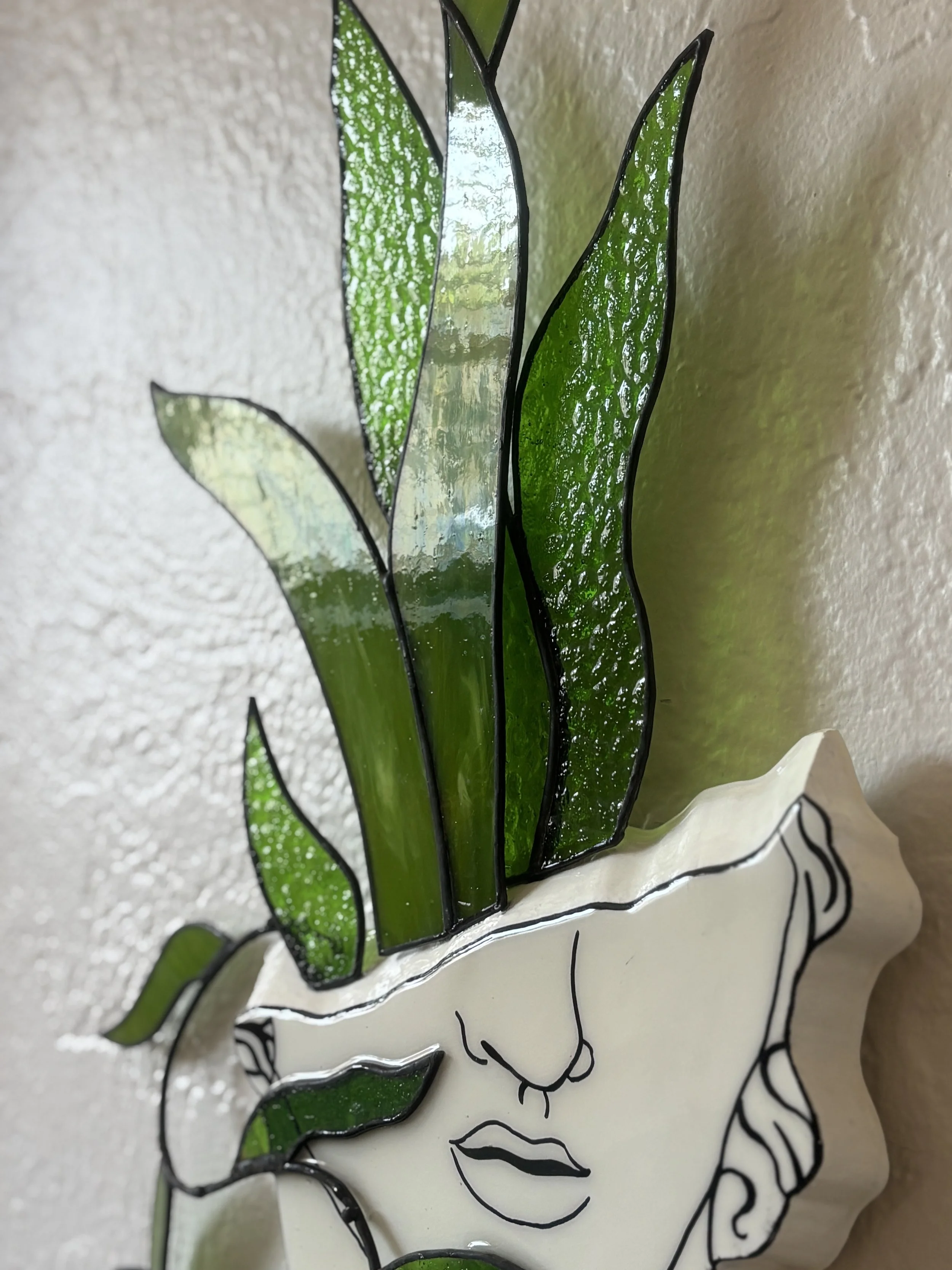 A Foam bust transformed into a vessel of growth, vivid textured glass blur the line between human and nature. fragile, alive, and in constant transformation.
