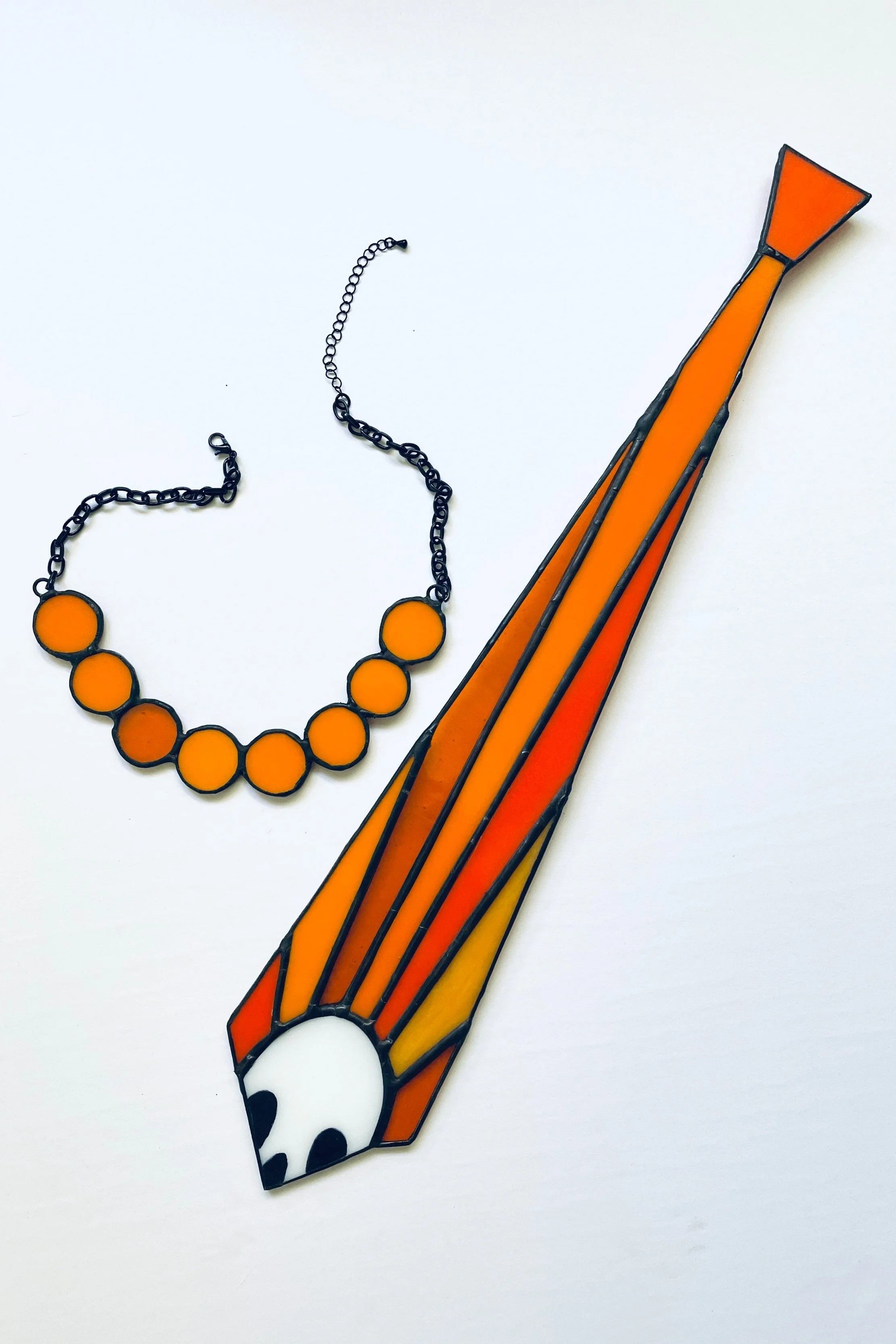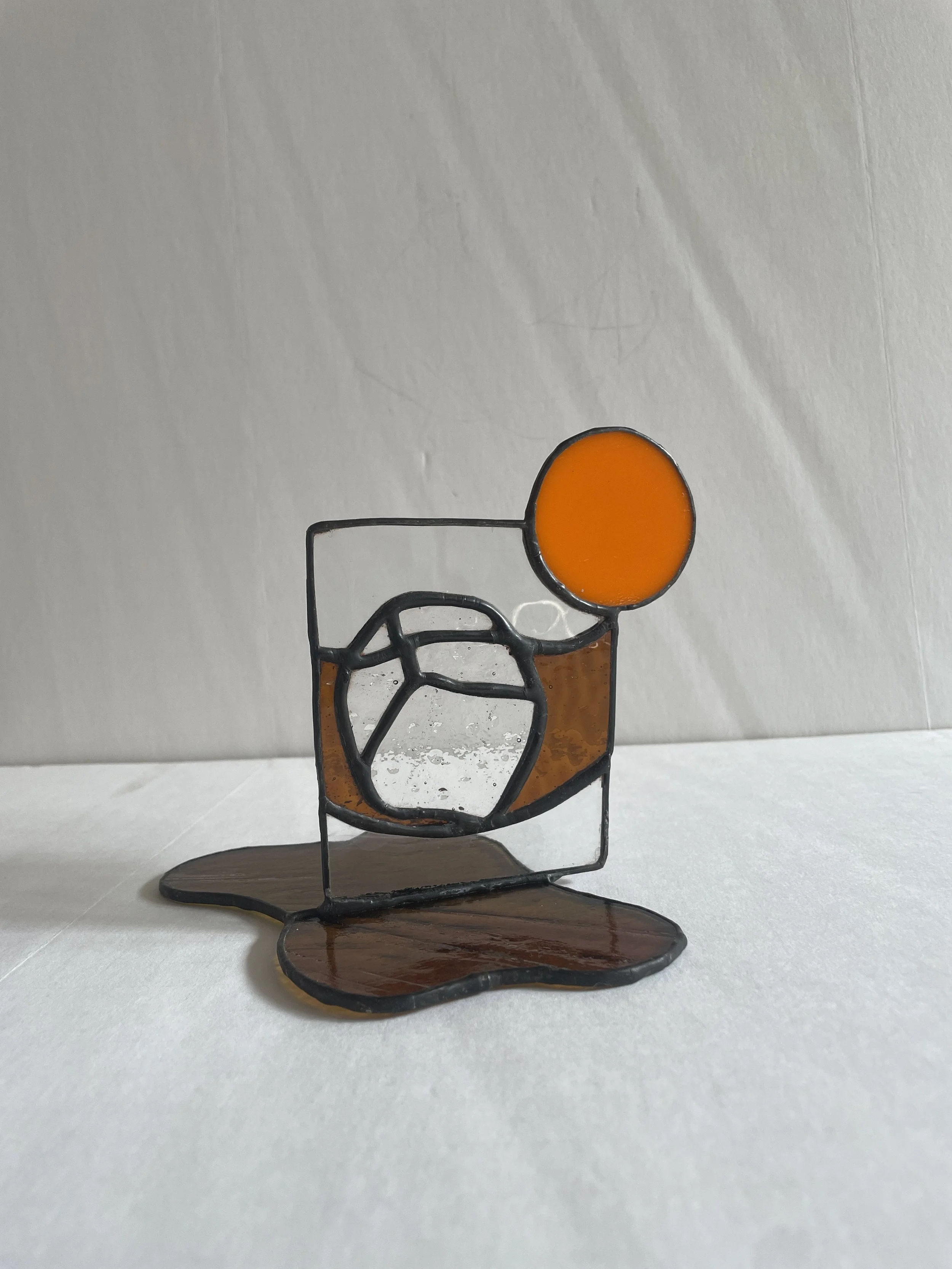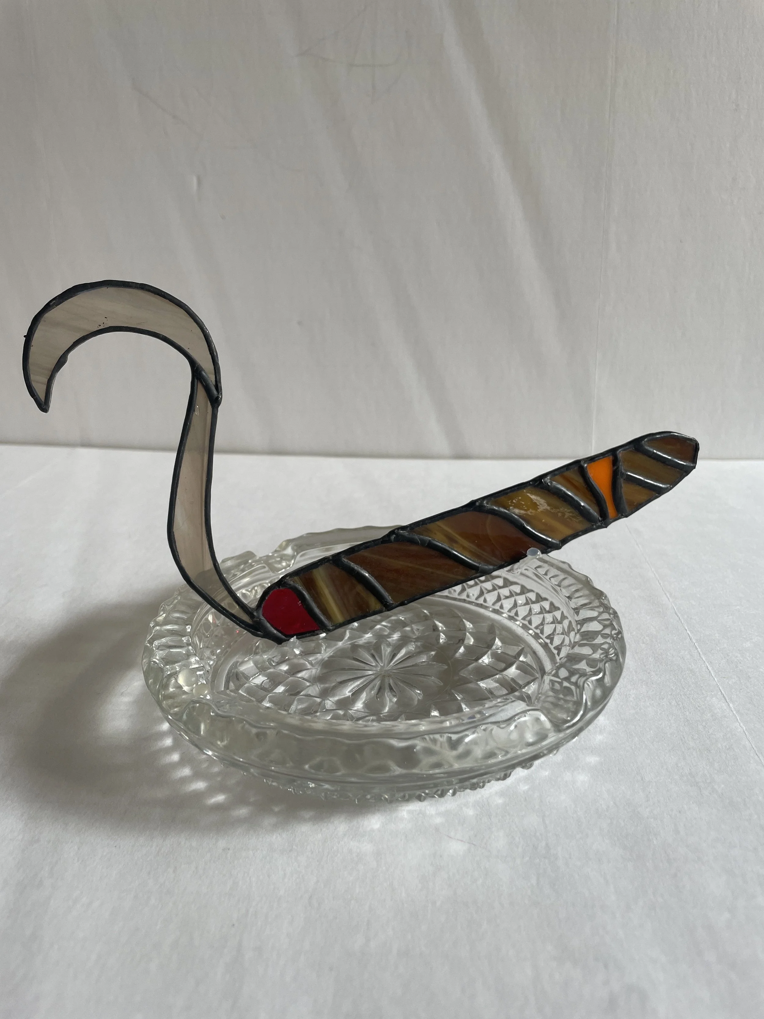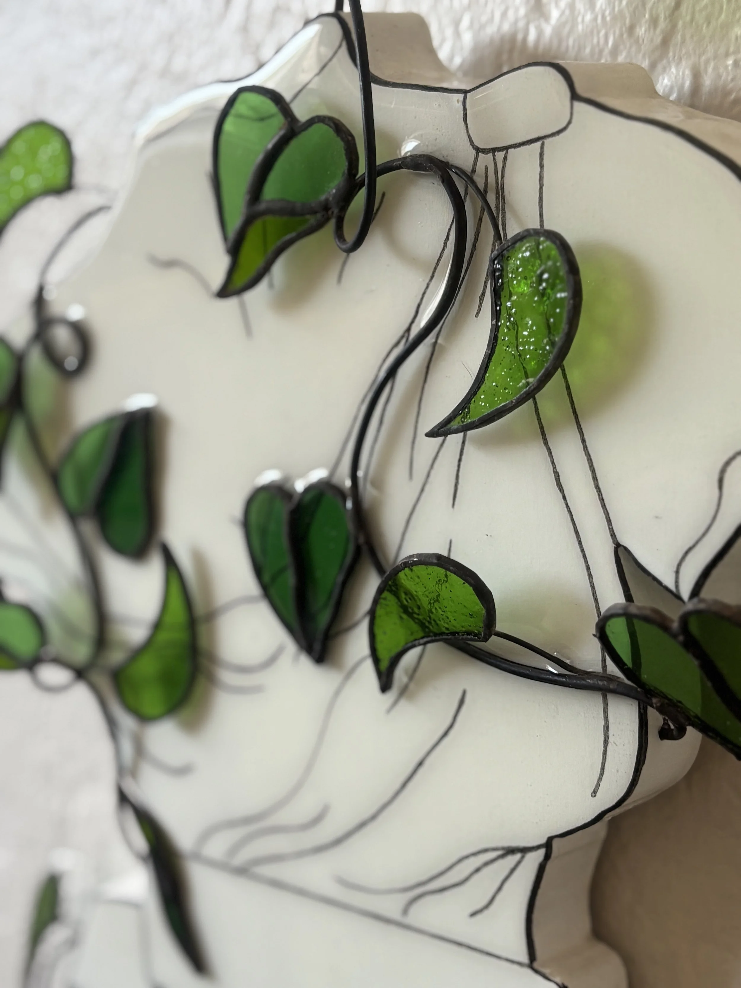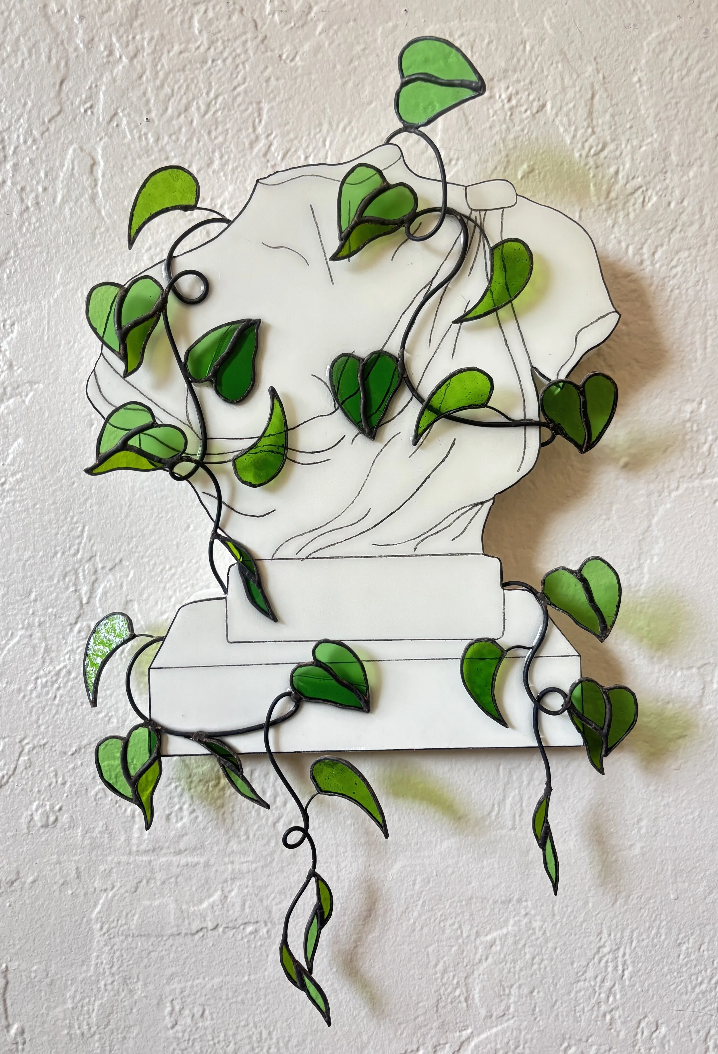 The piece merges classical imagery with living growth, balancing fragility and vitality in luminous glass.